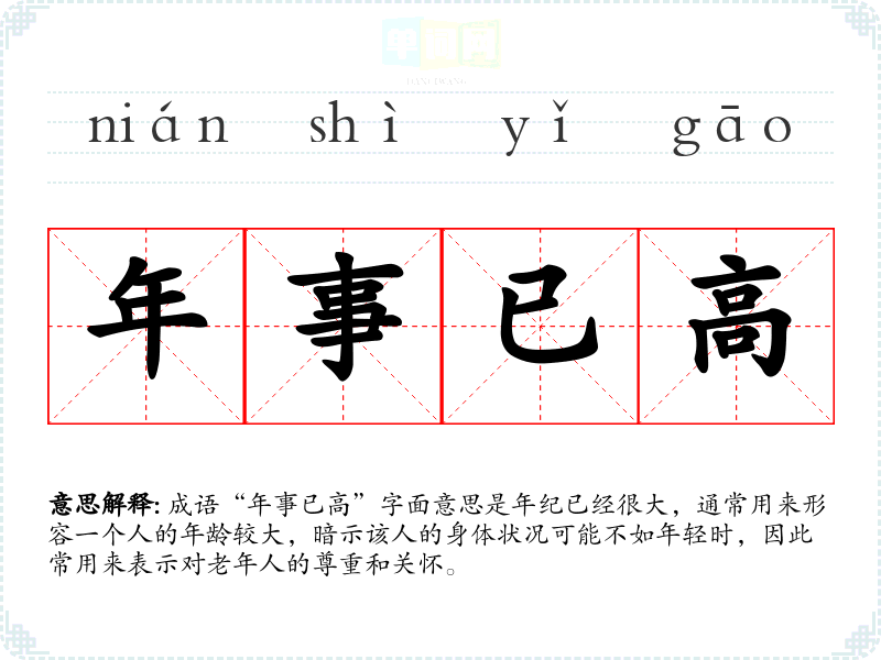 成语“年事已高”字面意思是年纪已经很大,通常用来形容一个人的年龄较大,暗示该人的身体状况可能不如年轻时,因此常用来表示对老年人的尊重和关怀。