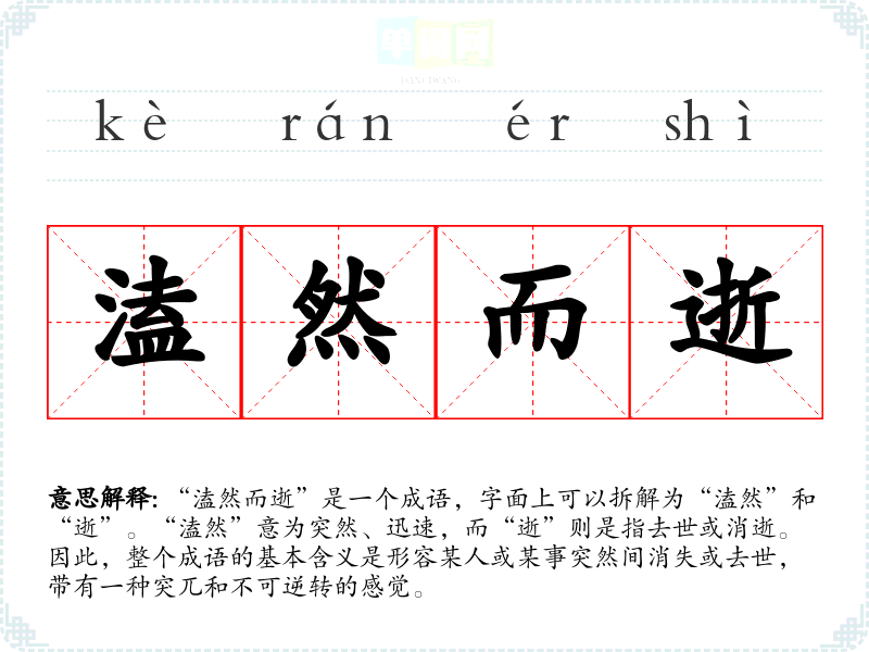 “溘然而逝”是一个成语,字面上可以拆解为“溘然”和“逝”。“溘然”意为突然、迅速,而“逝”则是指去世或消逝。因此,整个成语的基本含义是形容某人或某事突然间消失或去世,带有一种突兀和不可逆转的感觉。