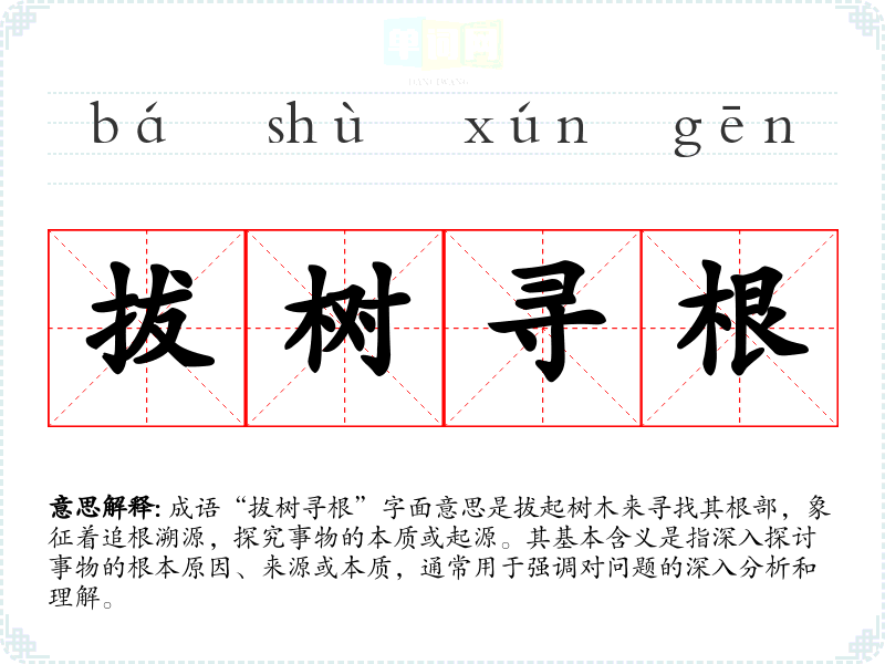 成语“拔树寻根”字面意思是拔起树木来寻找其根部,象征着追根溯源,探究事物的本质或起源。其基本含义是指深入探讨事物的根本原因、来源或本质,通常用于强调对问题的深入分析和理解。