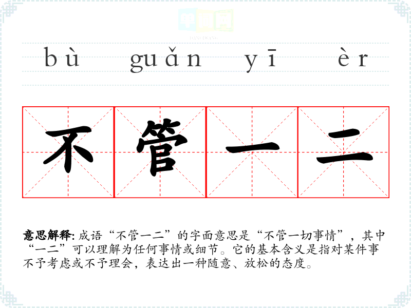 成语“不管一二”的字面意思是“不管一切事情”,其中“一二”可以理解为任何事情或细节。它的基本含义是指对某件事不予考虑或不予理会,表达出一种随意、放松的态度。