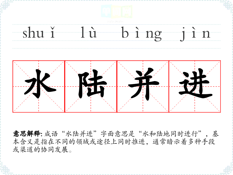 成语“水陆并进”字面意思是“水和陆地同时进行”,基本含义是指在不同的领域或途径上同时推进,通常暗示着多种手段或渠道的协同发展。