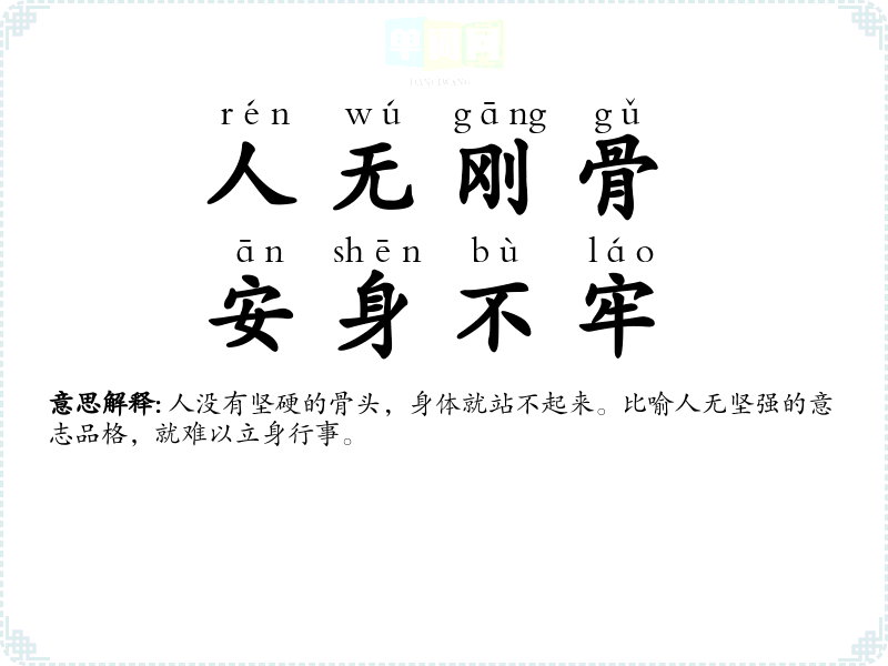 | 人无刚骨,安身不牢 | 人没有坚硬的骨头,身体就站不起来。比喻人无坚强的意志品格,就难以立身行事。 |