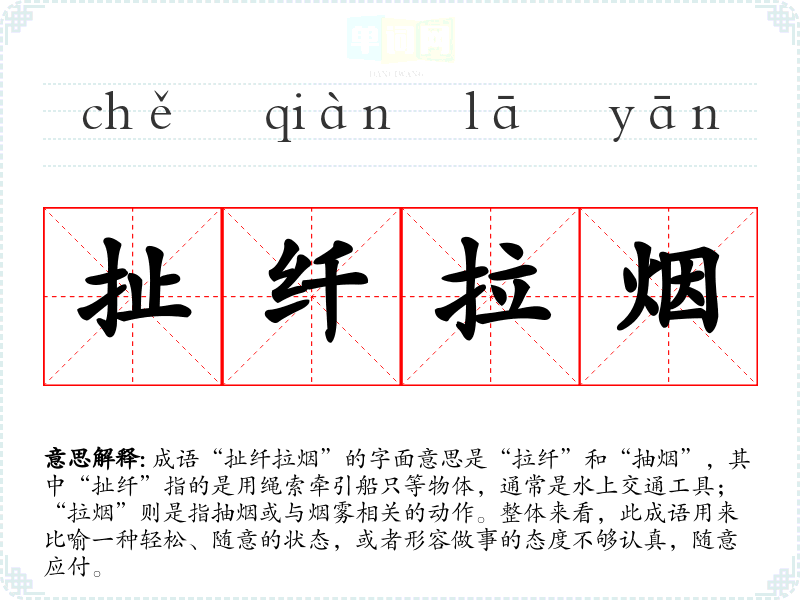 成语“扯纤拉烟”的字面意思是“拉纤”和“抽烟”,其中“扯纤”指的是用绳索牵引船只等物体,通常是水上交通工具;“拉烟”则是指抽烟或与烟雾相关的动作。整体来看,此成语用来比喻一种轻松、随意的状态,或者形容做事的态度不够认真,随意应付。
