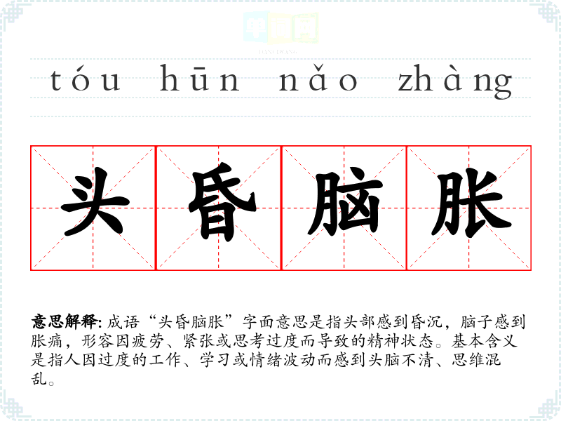 “头昏脑胀”的具体来源并没有明确的历史典故,但其字面构成和用法在古汉语中就已有类似表达。此成语在近现代汉语中逐渐流行,体现了现代人对精神状态的描述,尤其是在高强度工作和学习环境中。