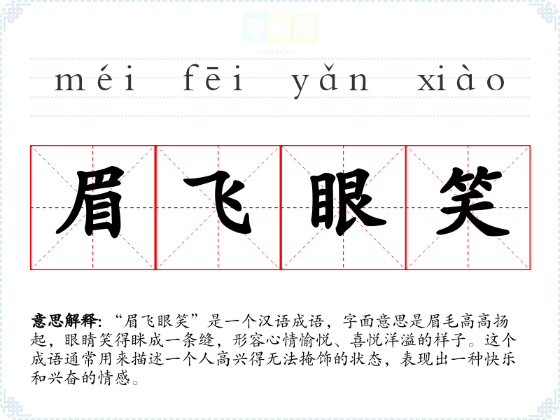“眉飞眼笑”是一个汉语成语,字面意思是眉毛高高扬起,眼睛笑得眯成一条缝,形容心情愉悦、喜悦洋溢的样子。这个成语通常用来描述一个人高兴得无法掩饰的状态,表现出一种快乐和兴奋的情感。