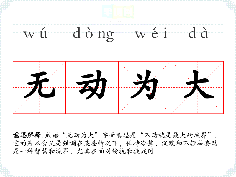 成语“无动为大”字面意思是“不动就是最大的境界”。它的基本含义是强调在某些情况下,保持冷静、沉默和不轻举妄动是一种智慧和境界,尤其在面对纷扰和挑战时。