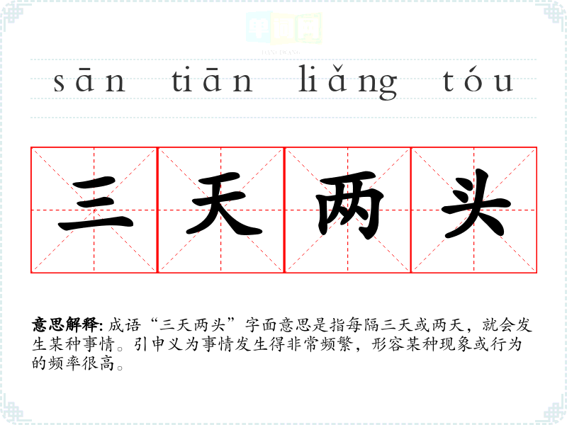 成语“三天两头”字面意思是指每隔三天或两天,就会发生某种事情。引申义为事情发生得非常频繁,形容某种现象或行为的频率很高。