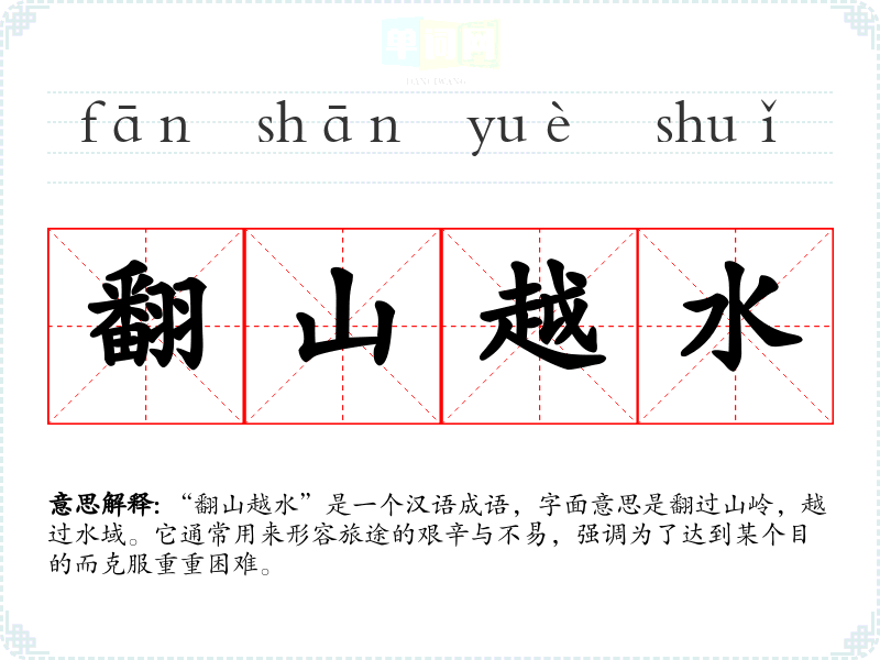 “翻山越水”是一个汉语成语,字面意思是翻过山岭,越过水域。它通常用来形容旅途的艰辛与不易,强调为了达到某个目的而克服重重困难。