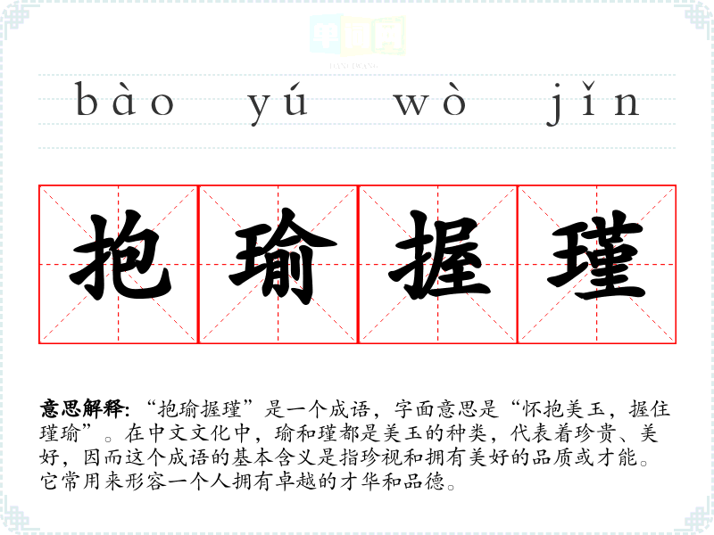 “抱瑜握瑾”是一个成语,字面意思是“怀抱美玉,握住瑾瑜”。在中文文化中,瑜和瑾都是美玉的种类,代表着珍贵、美好,因而这个成语的基本含义是指珍视和拥有美好的品质或才能。它常用来形容一个人拥有卓越的才华和品德。