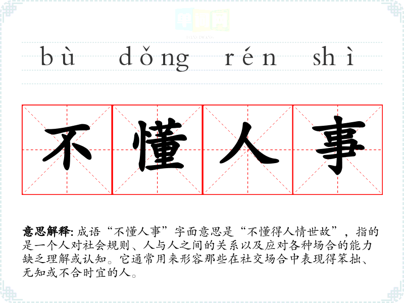 成语“不懂人事”字面意思是“不懂得人情世故”,指的是一个人对社会规则、人与人之间的关系以及应对各种场合的能力缺乏理解或认知。它通常用来形容那些在社交场合中表现得笨拙、无知或不合时宜的人。