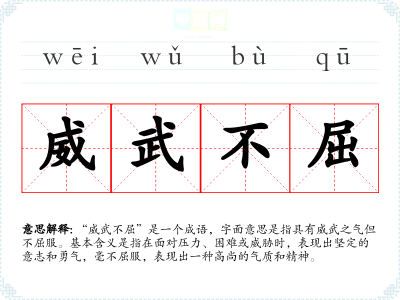 - 日常对话:在朋友之间讨论遇到困难时,可以用“威武不屈”来激励彼此,表达一种积极向上的精神。