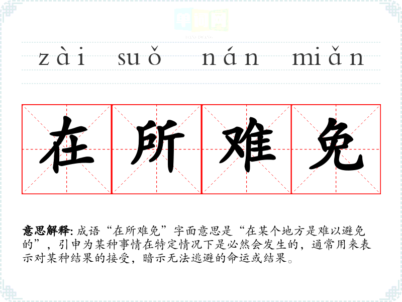 成语“在所难免”字面意思是“在某个地方是难以避免的”,引申为某种事情在特定情况下是必然会发生的,通常用来表示对某种结果的接受,暗示无法逃避的命运或结果。