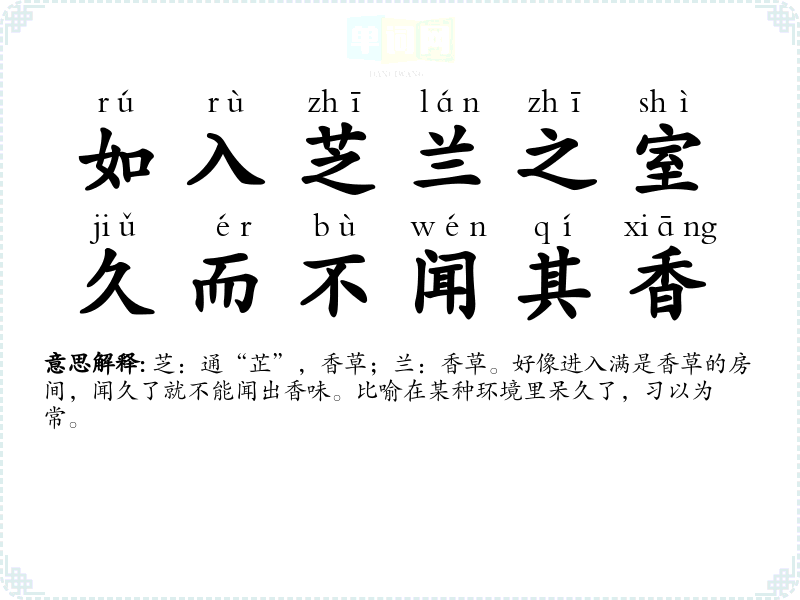| 如入芝兰之室,久而不闻其香 | 芝:通“芷”,香草;兰:香草。好像进入满是香草的房间,闻久了就不能闻出香味。比喻在某种环境里呆久了,习以为常。 |