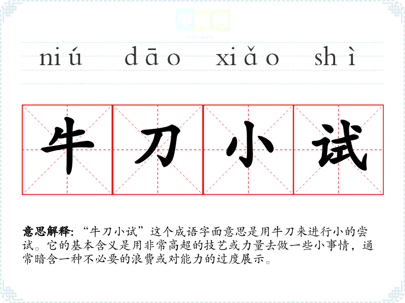 “牛刀小试”这个成语字面意思是用牛刀来进行小的尝试。它的基本含义是用非常高超的技艺或力量去做一些小事情,通常暗含一种不必要的浪费或对能力的过度展示。