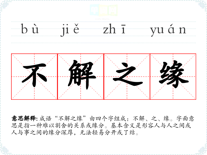 成语“不解之缘”由四个字组成:不解、之、缘。字面意思是指一种难以割舍的关系或缘分。基本含义是形容人与人之间或人与事之间的缘分深厚,无法轻易分开或了结。