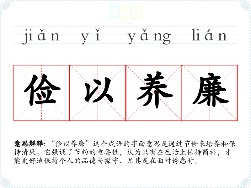 “俭以养廉”这个成语的字面意思是通过节俭来培养和保持清廉。它强调了节约的重要性,认为只有在生活上保持简朴,才能更好地保持个人的品德与操守,尤其是在面对诱惑时。