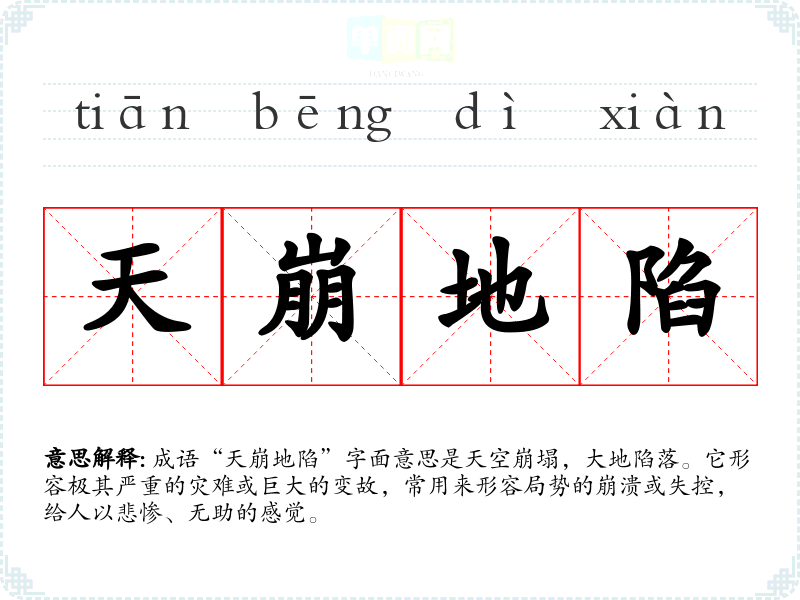 成语“天崩地陷”字面意思是天空崩塌,大地陷落。它形容极其严重的灾难或巨大的变故,常用来形容局势的崩溃或失控,给人以悲惨、无助的感觉。
