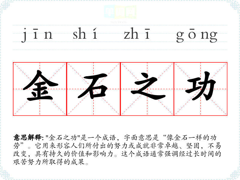 "金石之功"的来源可以追溯到古代文献中,最早见于《左传》:“有金石之功,故不敢弃。”这里强调通过持久努力所获得的成就。金石象征着坚硬和永恒,反映了成就的分量和可靠性。