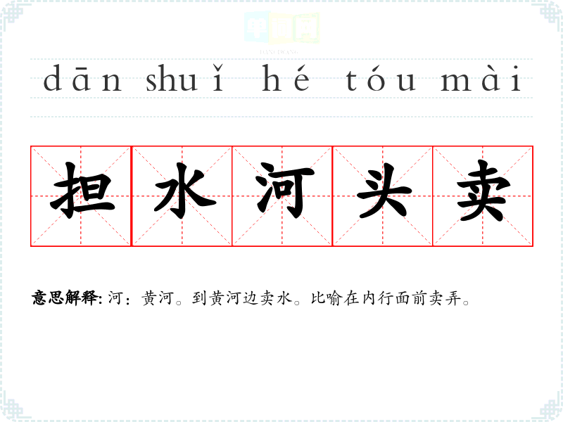 | 担水河头卖 | 河:黄河。到黄河边卖水。比喻在内行面前卖弄。 |