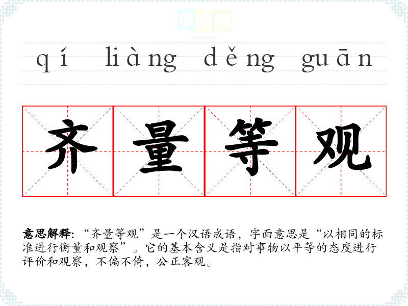 “齐量等观”是一个汉语成语,字面意思是“以相同的标准进行衡量和观察”。它的基本含义是指对事物以平等的态度进行评价和观察,不偏不倚,公正客观。