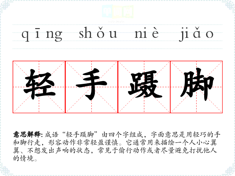 成语“轻手蹑脚”由四个字组成,字面意思是用轻巧的手和脚行走,形容动作非常轻盈谨慎。它通常用来描绘一个人小心翼翼、不想发出声响的状态,常见于偷行动作或者尽量避免打扰他人的情境。
