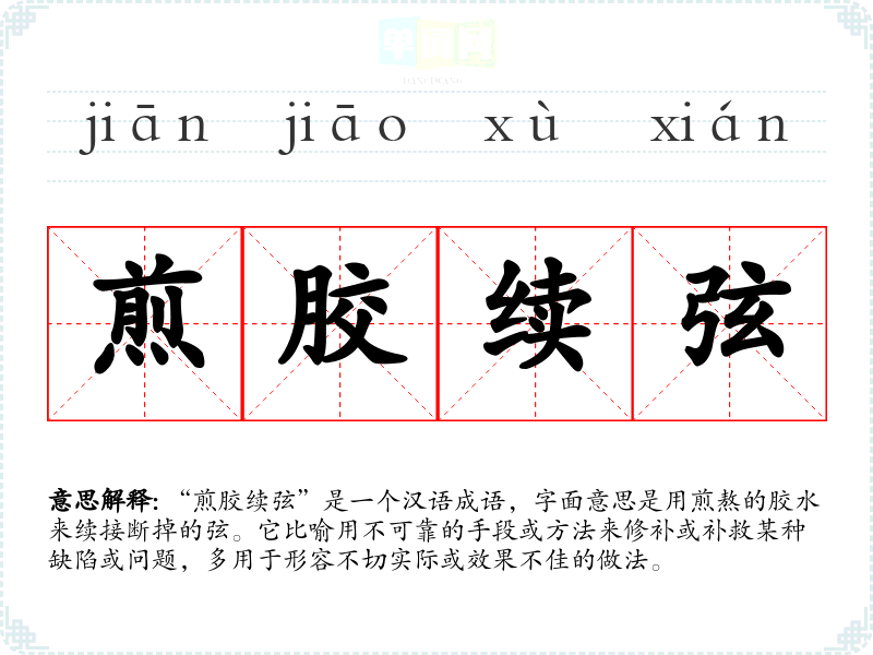 “煎胶续弦”是一个汉语成语,字面意思是用煎熬的胶水来续接断掉的弦。它比喻用不可靠的手段或方法来修补或补救某种缺陷或问题,多用于形容不切实际或效果不佳的做法。
