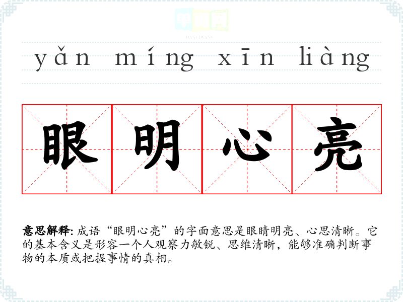成语“眼明心亮”的字面意思是眼睛明亮、心思清晰。它的基本含义是形容一个人观察力敏锐、思维清晰,能够准确判断事物的本质或把握事情的真相。