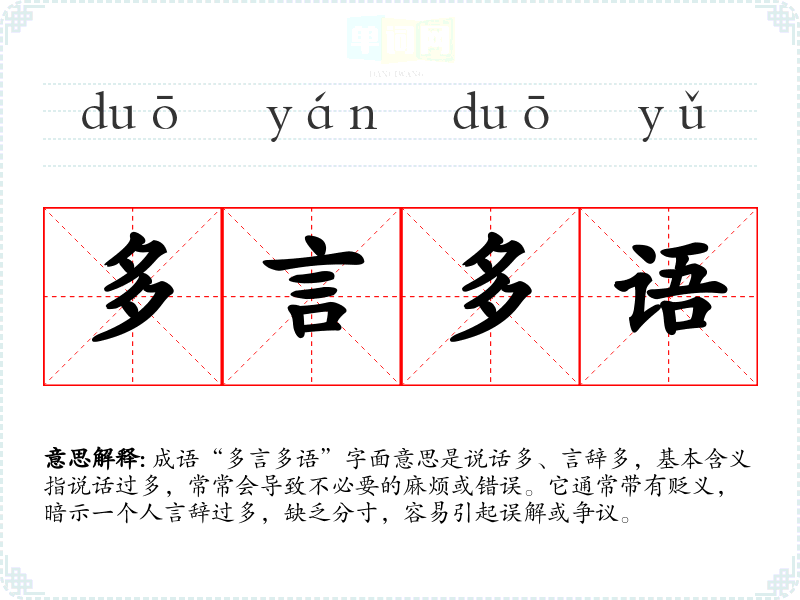 成语“多言多语”字面意思是说话多、言辞多,基本含义指说话过多,常常会导致不必要的麻烦或错误。它通常带有贬义,暗示一个人言辞过多,缺乏分寸,容易引起误解或争议。