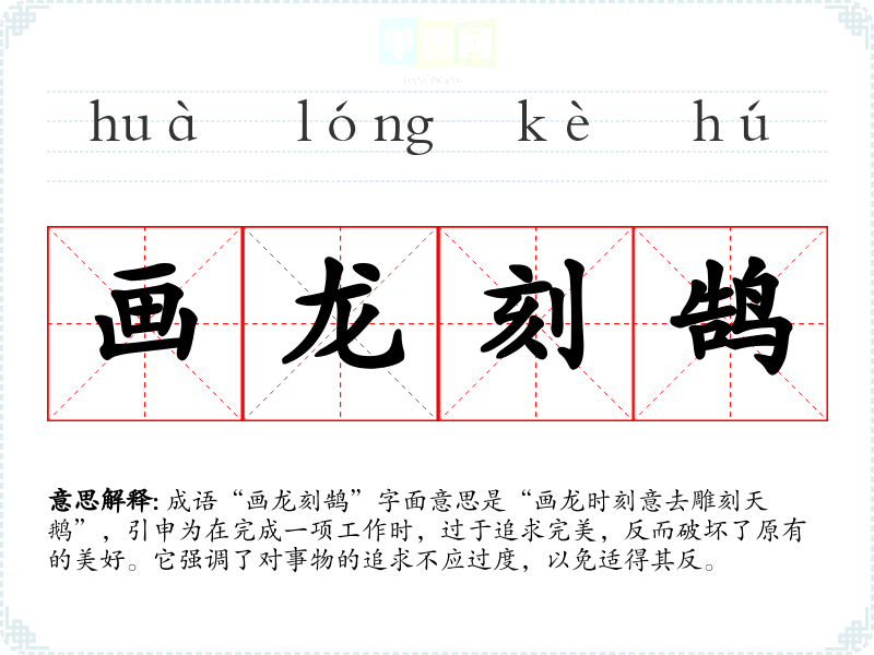 成语“画龙刻鹄”字面意思是“画龙时刻意去雕刻天鹅”,引申为在完成一项工作时,过于追求完美,反而破坏了原有的美好。它强调了对事物的追求不应过度,以免适得其反。
