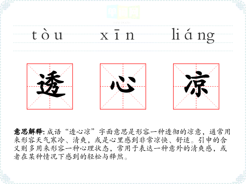 成语“透心凉”字面意思是形容一种透彻的凉意,通常用来形容天气寒冷、清爽,或是心里感到非常凉快、舒适。引申的含义则多用来形容一种心理状态,常用于表达一种意外的清爽感,或者在某种情况下感到的轻松与释然。