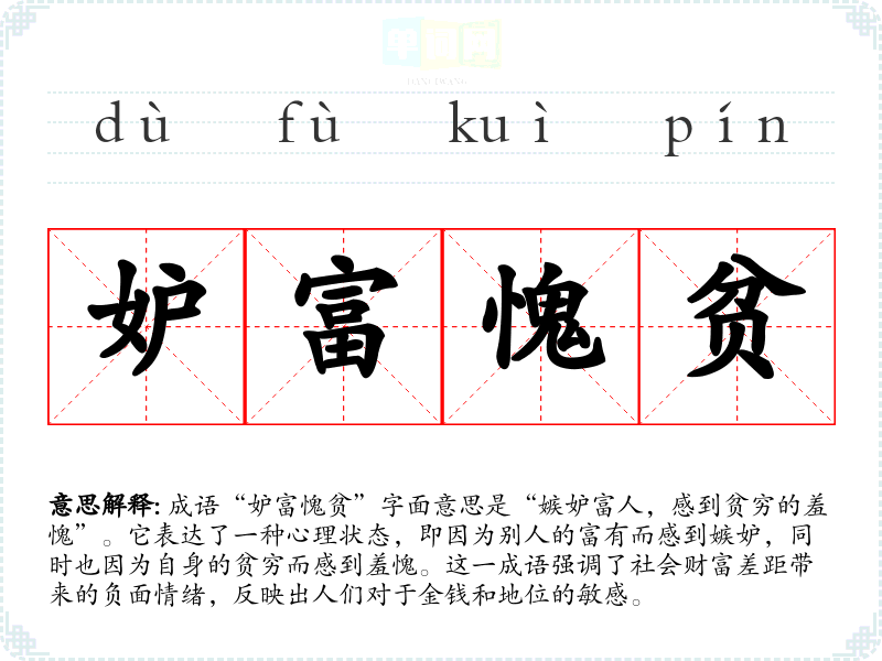 成语“妒富愧贫”字面意思是“嫉妒富人,感到贫穷的羞愧”。它表达了一种心理状态,即因为别人的富有而感到嫉妒,同时也因为自身的贫穷而感到羞愧。这一成语强调了社会财富差距带来的负面情绪,反映出人们对于金钱和地位的敏感。
