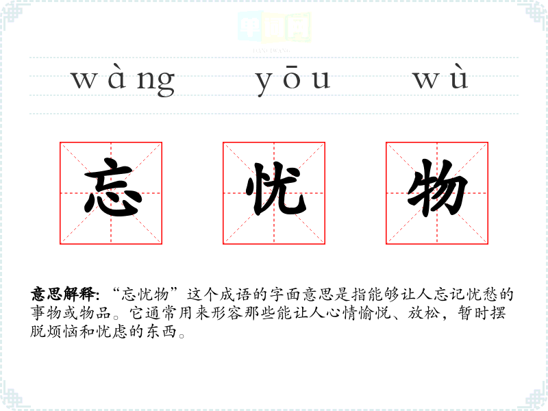 “忘忧物”这个成语的字面意思是指能够让人忘记忧愁的事物或物品。它通常用来形容那些能让人心情愉悦、放松,暂时摆脱烦恼和忧虑的东西。