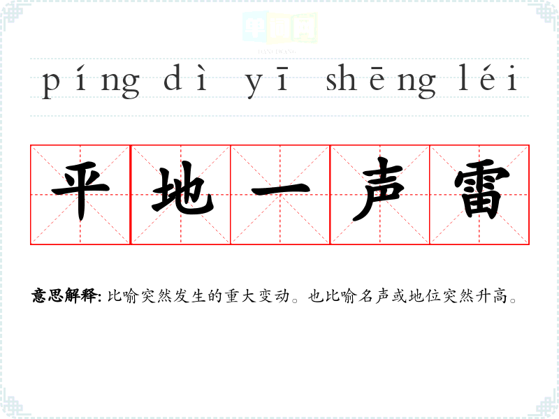| 平地一声雷 | 比喻突然发生的重大变动。也比喻名声或地位突然升高。 |