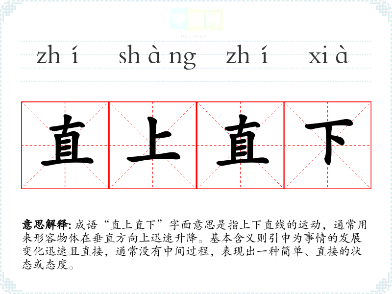 “直上直下”并没有具体的历史典故或文学出处,但其构成的字词都源于汉语的基本词汇,属于常用的表述方式。这个成语体现了汉语表达的简洁和生动,常用于描述事物的快速变化。