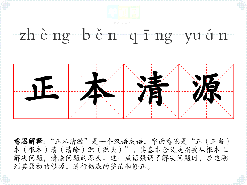 “正本清源”是一个汉语成语,字面意思是“正(正当)本(根本)清(清除)源(源头)”。其基本含义是指要从根本上解决问题,清除问题的源头。这一成语强调了解决问题时,应追溯到其最初的根源,进行彻底的整治和修正。