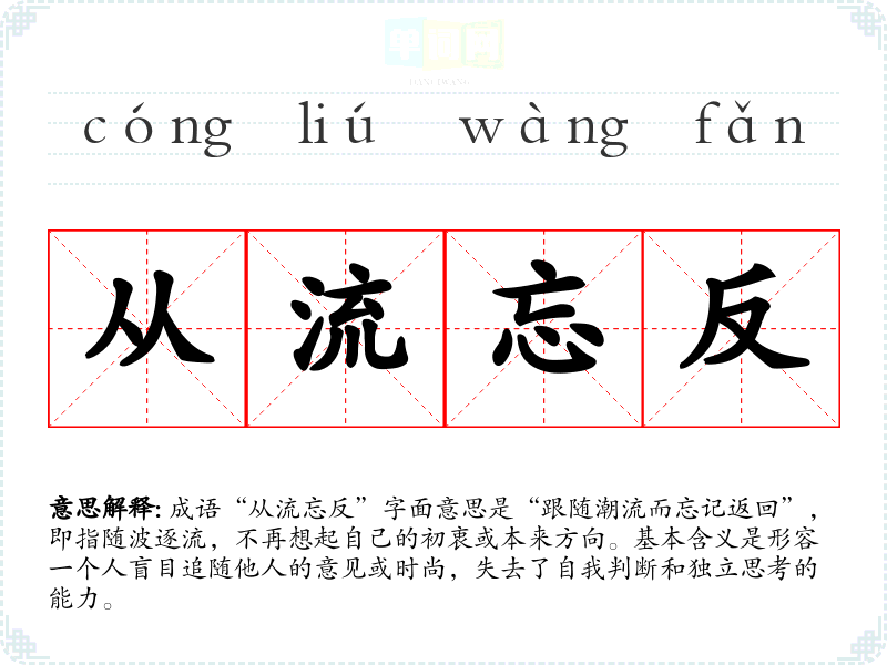 成语“从流忘反”字面意思是“跟随潮流而忘记返回”,即指随波逐流,不再想起自己的初衷或本来方向。基本含义是形容一个人盲目追随他人的意见或时尚,失去了自我判断和独立思考的能力。