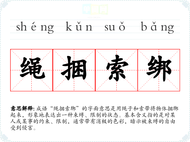 成语“绳捆索绑”的字面意思是用绳子和索带将物体捆绑起来,形象地表达出一种束缚、限制的状态。基本含义指的是对某人或某事的约束、限制,通常带有消极的色彩,暗示被束缚的自由受到侵害。