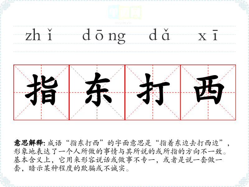 成语“指东打西”的字面意思是“指着东边去打西边”,形象地表达了一个人所做的事情与其所说的或所指的方向不一致。基本含义上,它用来形容说话或做事不专一,或者是说一套做一套,暗示某种程度的欺骗或不诚实。