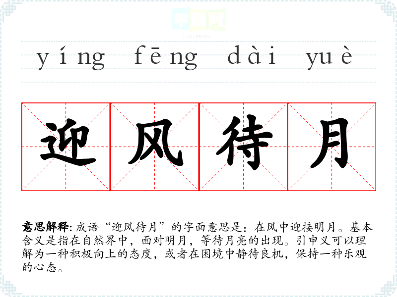 成语“迎风待月”的字面意思是:在风中迎接明月。基本含义是指在自然界中,面对明月,等待月亮的出现。引申义可以理解为一种积极向上的态度,或者在困境中静待良机,保持一种乐观的心态。