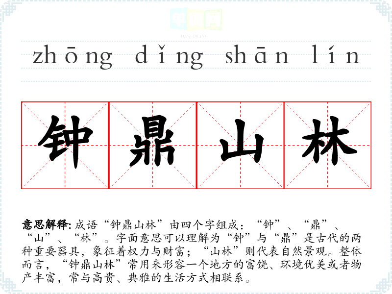 成语“钟鼎山林”由四个字组成:“钟”、“鼎”、“山”、“林”。字面意思可以理解为“钟”与“鼎”是古代的两种重要器具,象征着权力与财富;“山林”则代表自然景观。整体而言,“钟鼎山林”常用来形容一个地方的富饶、环境优美或者物产丰富,常与高贵、典雅的生活方式相联系。