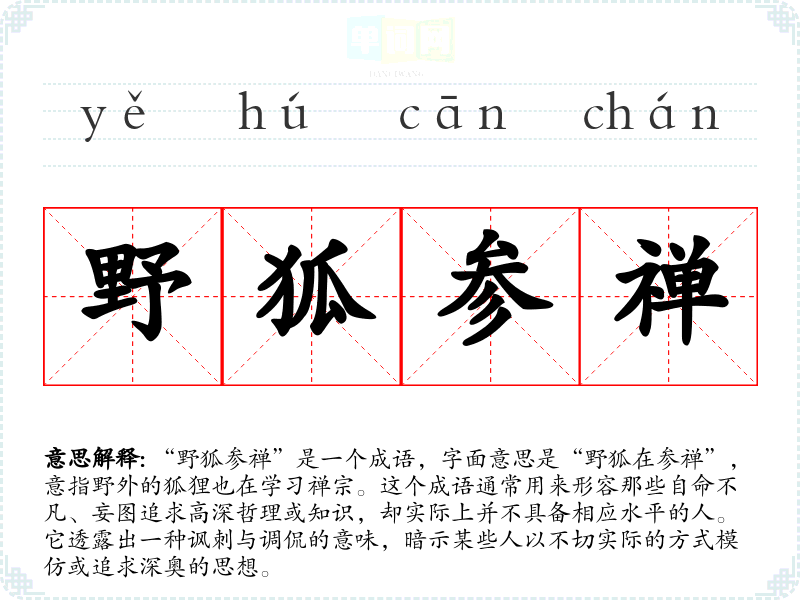 “野狐参禅”是一个成语,字面意思是“野狐在参禅”,意指野外的狐狸也在学*禅宗。这个成语通常用来形容那些自命不凡、妄图追求高深哲理或知识,却实际上并不具备相应水平的人。它透露出一种讽刺与调侃的意味,暗示某些人以不切实际的方式模仿或追求深奥的思想。
