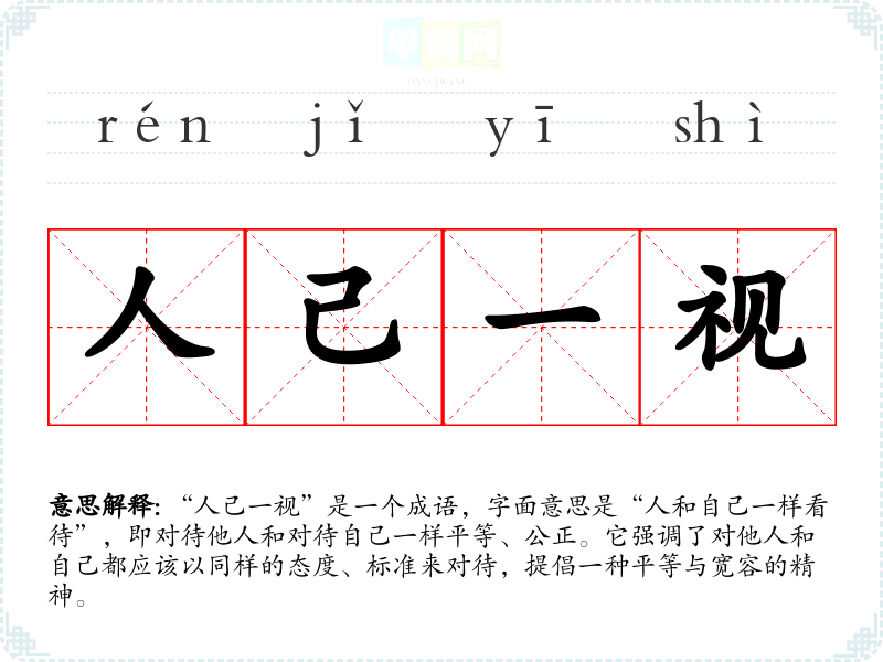 “人己一视”是一个成语,字面意思是“人和自己一样看待”,即对待他人和对待自己一样平等、公正。它强调了对他人和自己都应该以同样的态度、标准来对待,提倡一种平等与宽容的精神。