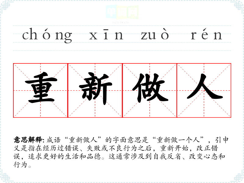 成语“重新做人”的字面意思是“重新做一个人”,引申义是指在经历过错误、失败或不良行为之后,重新开始,改正错误,追求更好的生活和品德。这通常涉及到自我反省、改变心态和行为。