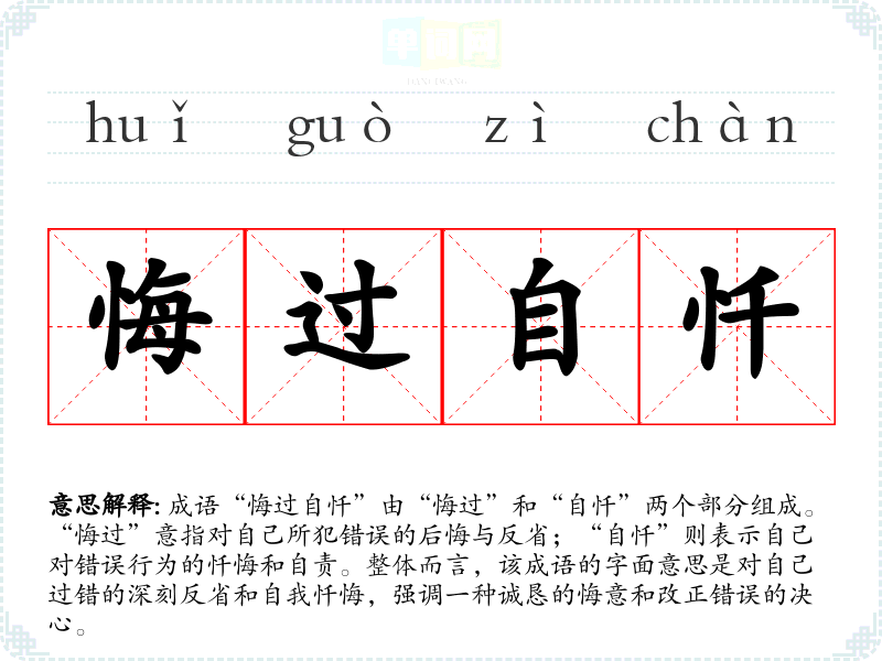 成语“悔过自忏”由“悔过”和“自忏”两个部分组成。“悔过”意指对自己所犯错误的后悔与反省;“自忏”则表示自己对错误行为的忏悔和自责。整体而言,该成语的字面意思是对自己过错的深刻反省和自我忏悔,强调一种诚恳的悔意和改正错误的决心。