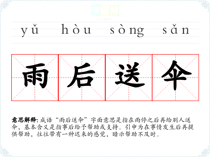 成语“雨后送伞”字面意思是指在雨停之后再给别人送伞,基本含义是指事后给予帮助或支持。引申为在事情发生后再提供帮助,往往带有一种迟来的感觉,暗示帮助不及时。
