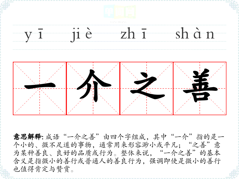 成语“一介之善”由四个字组成,其中“一介”指的是一个小的、微不足道的事物,通常用来形容渺小或平凡;“之善”意为某种善良、良好的品质或行为。整体来说,“一介之善”的基本含义是指微小的善行或普通人的善良行为,强调即使是微小的善行也值得肯定与赞赏。