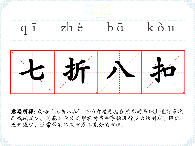 成语“七折八扣”字面意思是指在原本的基础上进行多次削减或减少。其基本含义是形容对某种事物进行多次的削减、降低或者减少,通常带有不满意或不充分的意味。