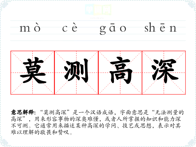 “莫测高深”是一个汉语成语,字面意思是“无法测量的高深”,用来形容事物的深奥难懂,或者人所掌握的知识和能力深不可测。它通常用来描述某种高深的学问、技艺或思想,表示对其难以理解的敬畏和赞叹。