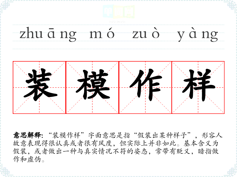 | 装模作样 | 样:模样、姿态。指故意做作,故做姿态。 |