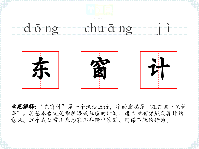 “东窗计”源于《东周列国志》中的一个故事。这个故事讲述了春秋时期,晋国的权臣屠岸贾为了谋取权利,暗中与敌国勾结,最终被揭发。故事中提到他在东窗下策划阴谋,因此“东窗计”便成为了形容阴谋的成语。